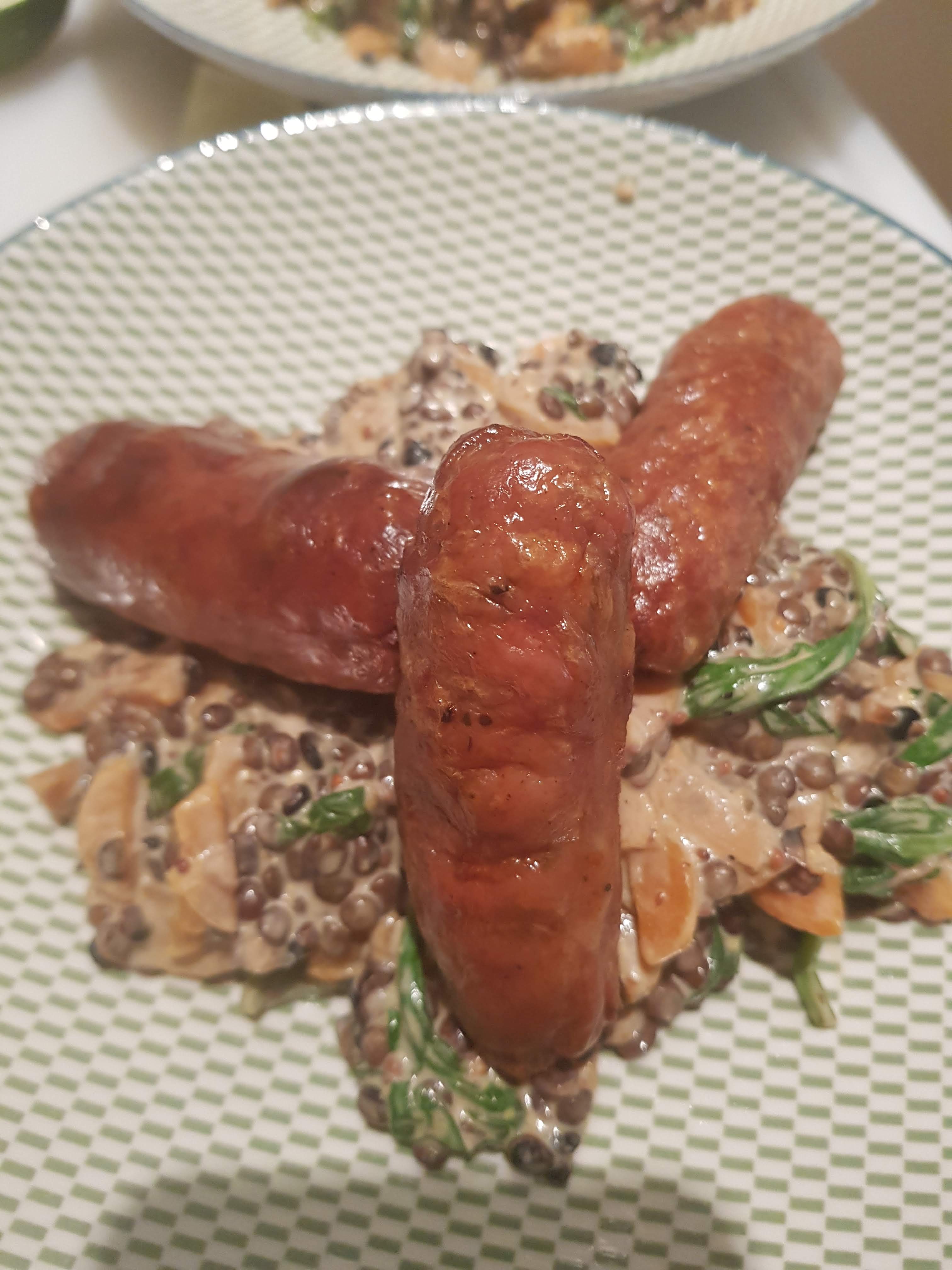 Sausage with Mustardy Lentils and Garlic Bread (serves 2) (based on a Hello Fresh Recipe)