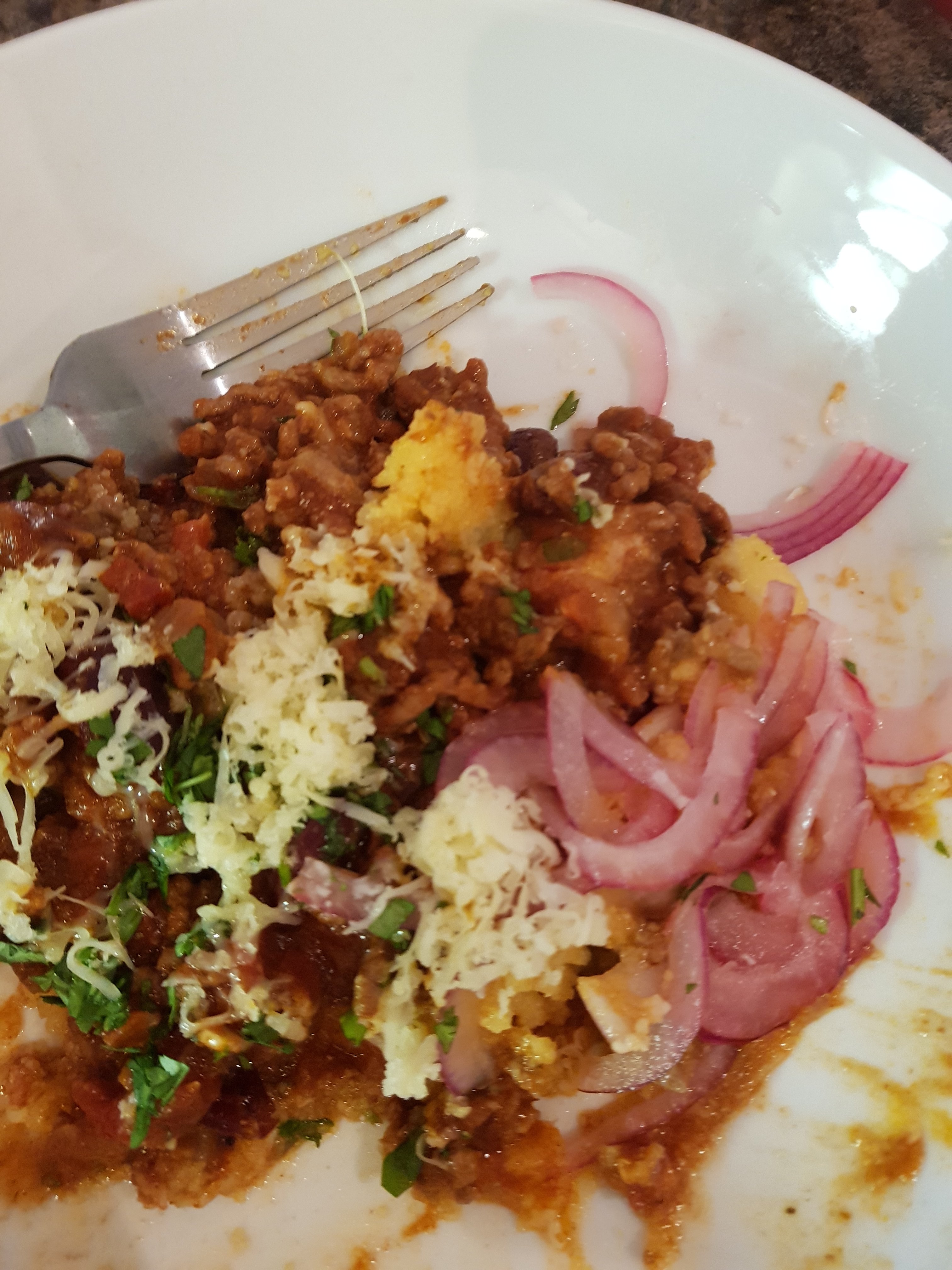 So, like my mum, I have a pretty good ability to make a meal out of “nothing”. My cupboard is always pretty full of tins and jar or things leftover from recipes I’ve tried and with storage always being a challenge in London flats I am trying to cook new things to use up. Today’s ingredient on the chopping block: polenta. I also had a big pack of beef mince in the “freezer” (tiny ice box at the top of my small fridge). I found a great recipe on the Tesco website for Mexican Chilli Beef with Creamy Polenta and pickled red onion. Link below