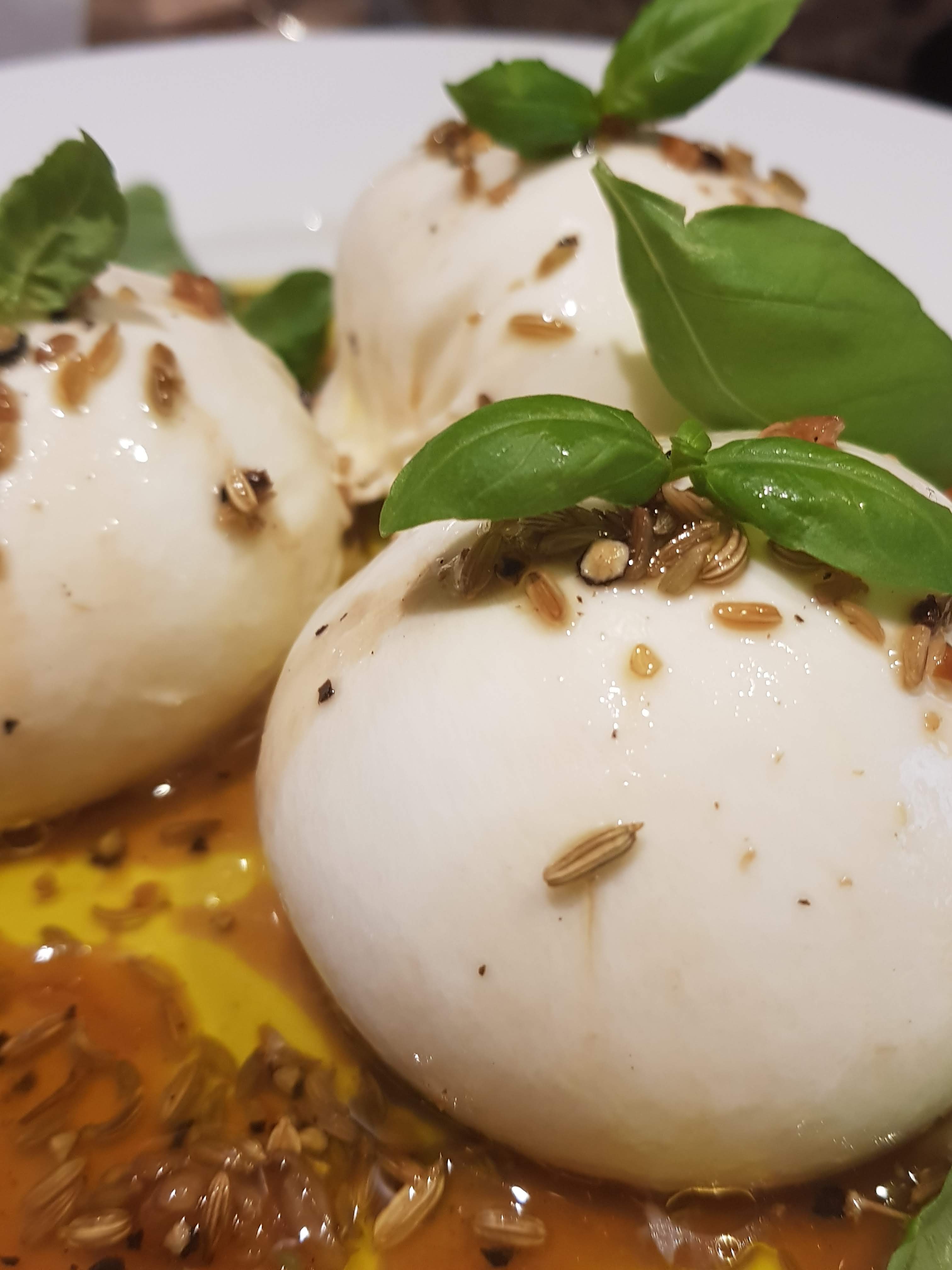 Starter: Burrata with Marinated grilled grapes and warm pita