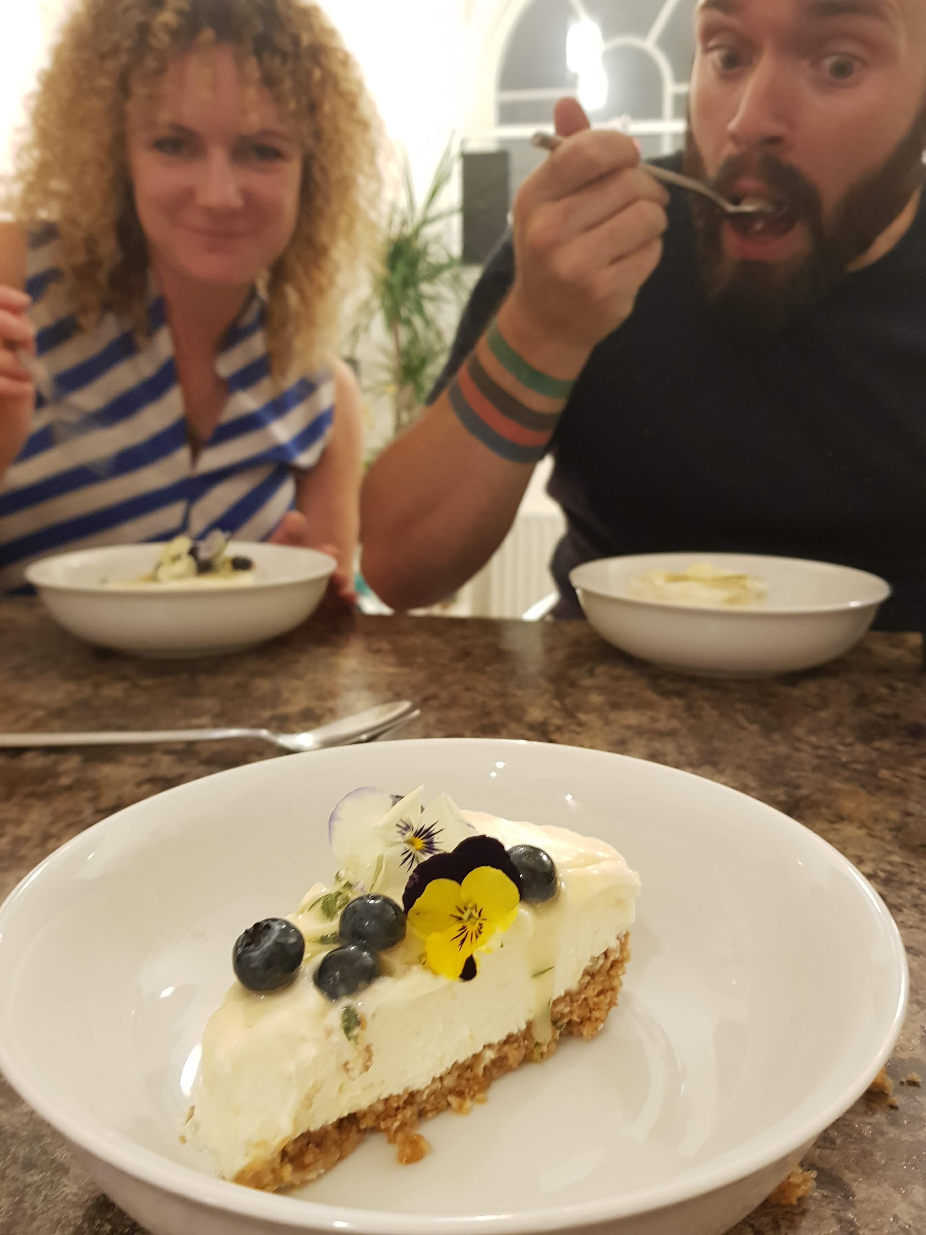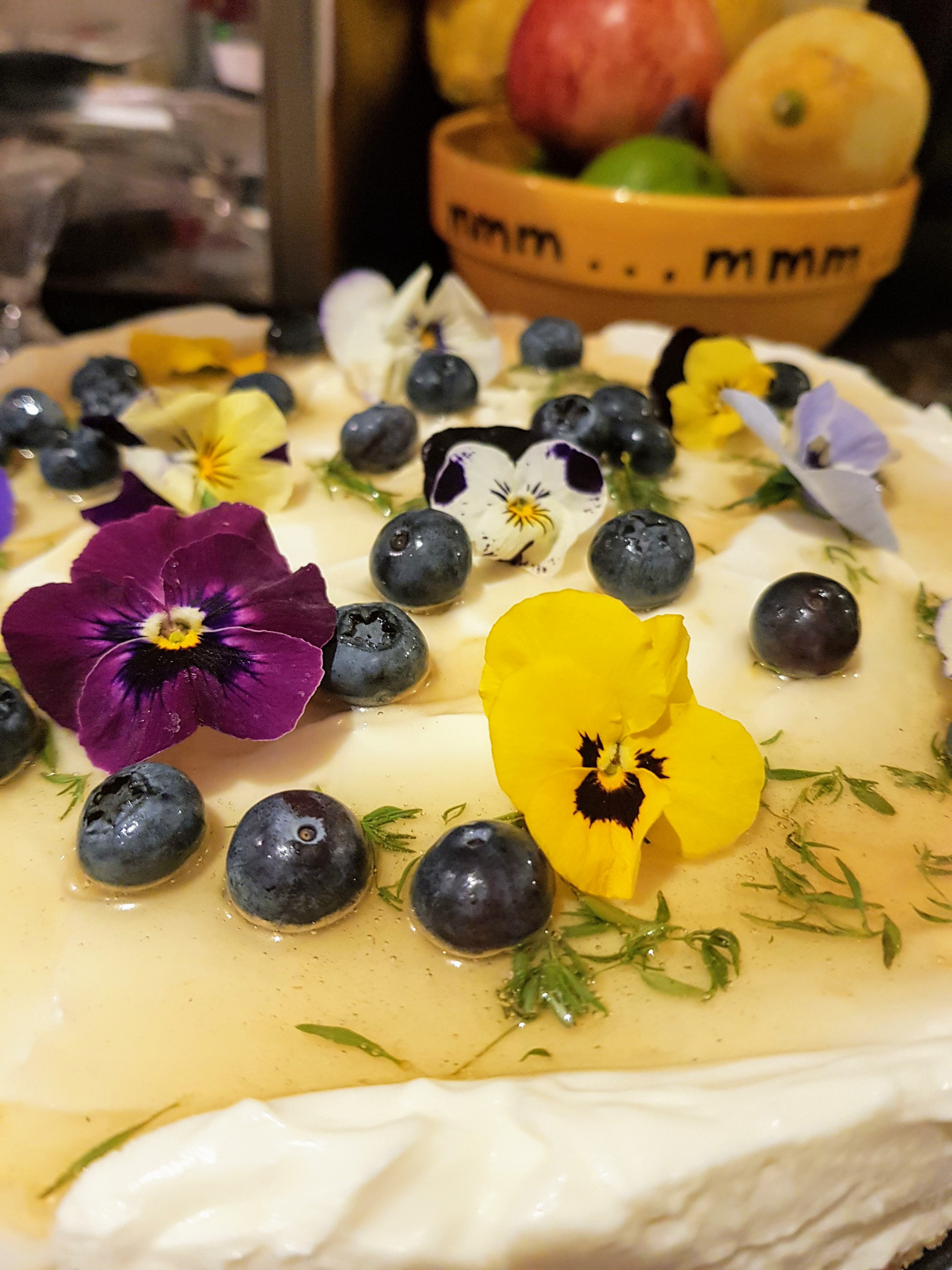 Dessert – Honey & Yoghurt Cheesecake with blueberries and edible flowers